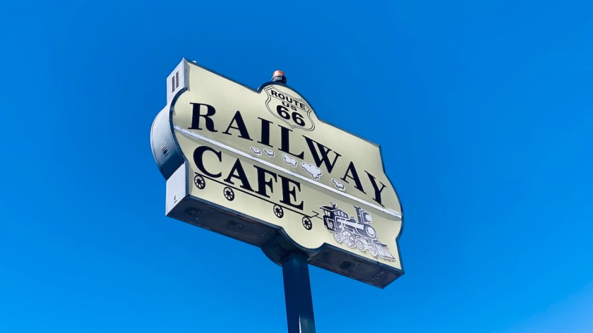 Saturday I took the bike out to explore the local area. I started with lunch at the Route 66 Railway Cafe. It’s right on Historic Route 66, but it doesn’t have the charm and cheese of the countless Route 66 sites I visited last year. It has model trains scattered around inside, and a lot of the food has railroad-related names, but there wasn’t really anything tying it directly to the railroad either. The tracks are across the street, so it’s not even like this was an old station or something. It’s best to think of this place as your standard diner with a Route 66 and railroad theme. The food was good, by those standards. I had a chili burger, which they wisely served as an open face to eat with a fork and knife, not your hands.