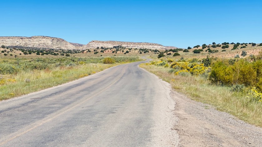 But then I continued down Route 66. There might have been a “road closed sign” involved somewhere. I’m not sure why. The road was in great shape, but it was also straight, flat, and boring. I turned around, went back toward camp again, but then continued past it, up Route 566 to the north. This took me through many red, tan, and similarly colored rock canyons that looked right out of a Roadrunner cartoon.