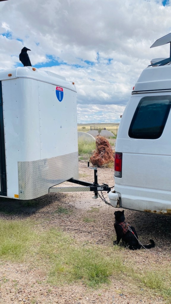 We had a visitor at lunchtime. First I heard some interesting bird noises, the same as I heard during a stop in Petrified Forest National Park yesterday. I also heard the sound of something big walking across a metal roof. Finally, I saw a giant raven hanging out on the roof of my trailer. We exchanged a few stares, but neither of us bothered, or was bothered by, the other. We were both just hanging out.