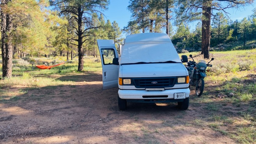 I’m getting low on clean laundry and some supplies I can’t get here in Tusayan (specifically, Lister’s preferred cat food), so I will likely make the drive down to Williams tomorrow to take care of that. I haven’t yet decided whether I’ll detach the trailer, make the trip, and come back, or move to a new campsite down in that area. The weather’s just about the same. There are a lot of mixed reviews of numerous dispersed campsites around Williams and Flagstaff, and I have a good one here, so I might just make an afternoon trip out of it and come back.