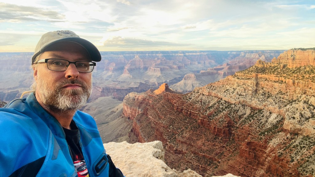Afterward I took myself back to the actual Grand Canyon to watch the sunset. Instead of Mather Point, where everyone goes, I rode down to the first overlook to the east, which was much less crowded. It was so quiet that I was able to pull up a seat on the edge of the canyon itself to watch. The colors weren’t as brilliant with all the clouds in the sky, but they added some color of their own later. Also, that big cloud right next to my head in this picture looks like an Imperial Star Destroyer.