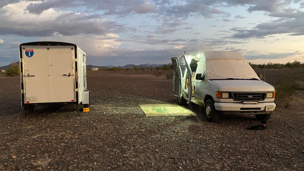 I surveyed the damage this morning, and there wasn’t any. The only loss I experienced was one of my magnets that was (unsuccessfully) holding the windshield cover down. It flew off somewhere and I haven’t found it. Everything inside the trailer was fine. My Starlink antenna on its magnetic roof mount hadn’t budged a bit. We’re all good.