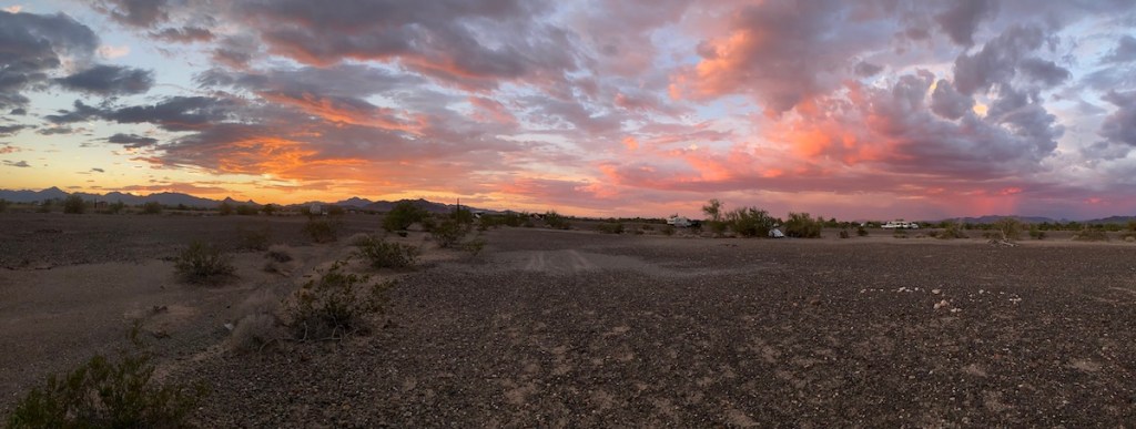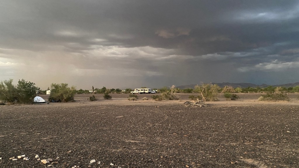 You know the saying “Red in the morning, sailors take warning, red at night, sailors’ delight?” It must work backwards in the desert. When the brilliant colors had gone away, the northeast looked more like Mordor — and it was approaching.