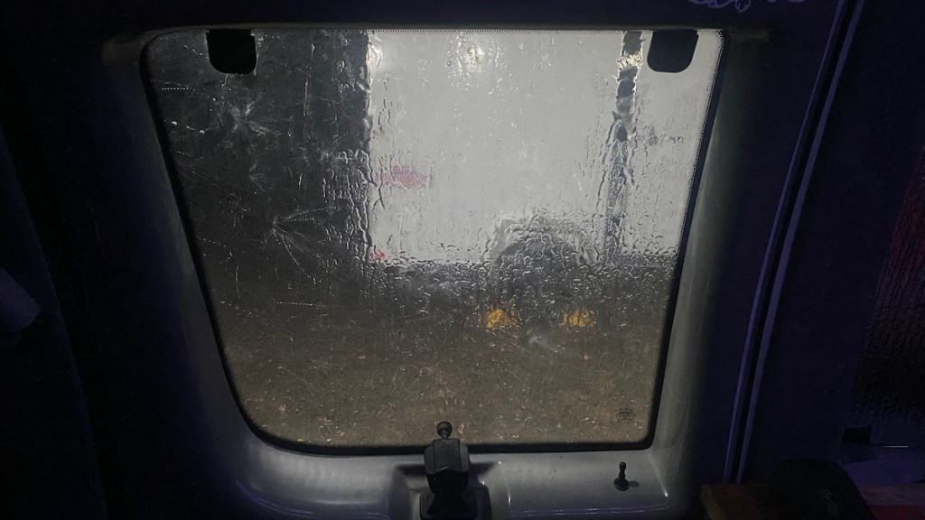 For the first time ever, a little water leaked into the van. This didn’t even happen when I sat through a hurricane. It came in through the side door seals. These are normally covered by the doorway, but the wind was blowing the rain sideways. As luck would have it, the leak was directly above my sink! I laid out a dish towel to soak up any water that would hit the surrounding wood, but most of what leaked in simply went down the drain. How convenient!