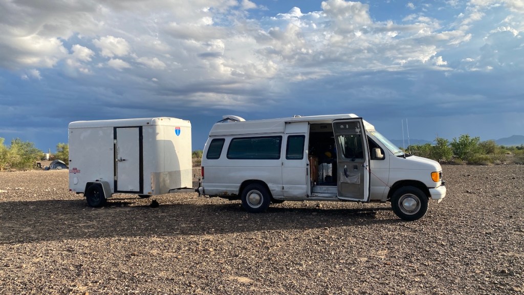 I left the van and trailer hooked up overnight. I didn’t want to set up camp again in the dark, but more importantly we were under a flash flood warning until 9:00 pm. The major washes in and around town were flowing with runoff from the surrounding mountains, blocking the roads they flowed across. Scale up this little wash by an order of magnitude or two, and you can see why officials practically yell at you to not drive across them when they’re full. The force could sweep you away. But we had no problems overnight.