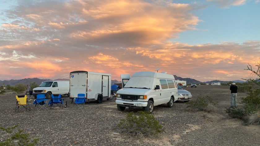 We talked about old times and caught up on what we’ve been up to lately. We were treated to a spectacular sunset, inspiring Chang to break out his professional-grade camera and take some pictures. I invited him to spend the night here before moving on to Joshua Tree, an offer he took me up on. This meant we could enjoy a leisurely dinner and beer, as well as the amazing night sky. As soon as he mentioned he had a microwave oven in his van, Yellow Wolf and I gave him some microwave popcorn we had kicking around because we had no way to pop it ourselves! He left bright and early this morning. Although he was only here for one night, he got the full Quartzsite van life experience during his stay.