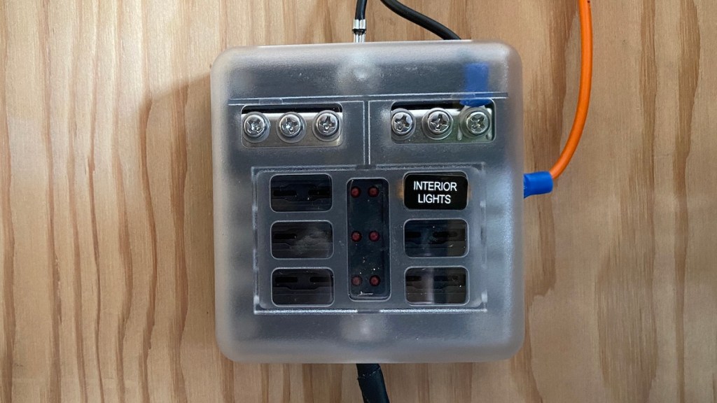 In other news, I built the beginning of my trailer’s electrical system. I installed the fuse box (same as I have in my van, except smaller), wired it up to one of my old AGM batteries, and to the LED strip lights I’d already installed in the trailer. Now I can turn my lights on and off from the doorway, without having to step inside and turn on my Jackery to do it. In fact, I don’t need my Jackery in the trailer at all now. I’ll add more circuits later for outlets and charging stations once I figure out where I want them to be.