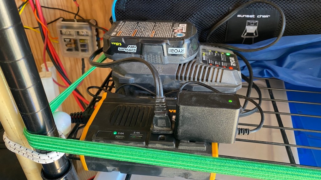 I finally found the cheap 250-watt power inverter I got at Love’s when I was trying to troubleshoot my Starlink issues. I made the mistake of buying an inverter that is not pure sine wave, which means I shouldn’t run sensitive electronics on it. But I can run chargers and less critical items. So I cut the clamps off the power cord that’s supposed to clamp directly to a battery, and wired it directly to the fuse box in the trailer instead. This gives it a dedicated circuit just like in my van. Now the charger and batteries for my power tools can stay in the same place as the tools they go with. I can also charge my heated gloves where all my motorcycle stuff lives.