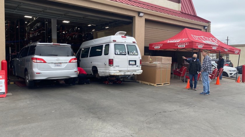 Their text message updates told me when my van finally got into a bay, which was when I closed out my tab and walked back. Sure enough, the van was inside with its back wheels off — including the one that I couldn’t remove for the life of me. It was finished quickly and I was on my way. After my last experience, I double-checked the rear tire pressures and found them right at 80 psi where they belong. I’ll check the lug nut torque before I head back to Arizona, and make sure they’re not too tight like they used to be. I saw them using cordless impact wrenches to put the lug nuts back on, which can’t tighten them as much as the air-powered kind. That’s a good thing.
