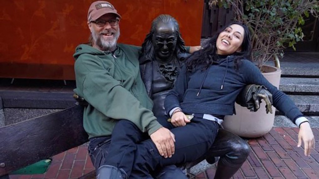 While exploring the area we found a bench with Ben Franklin on it for no explained reason. Ghazale and I got friendly with him. What? We were in a silly mood and enjoying ourselves.