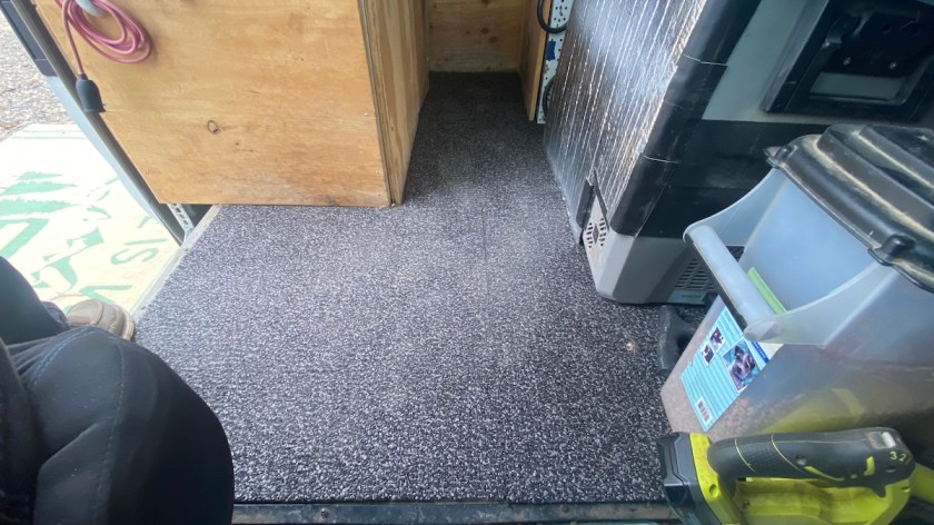 On cold mornings, I dread stepping on a cold floor to go turn on the heater, let Lister out, or do whatever else I need to do. I wasn’t able to insulate my floor because it already came specially built with the wheelchair van conversion. I found a cheap, easy solution that can either be permanent or just a temporary job.