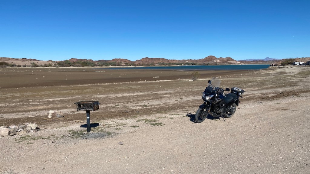 Right outside the LTVA, I visited the South Shore. Normally you can camp right by the water here, but right now the level is so low that you’d have to take quite a walk to get there. You can see from where I’m parked and where this grill is that the water is supposed to be up here, but instead it’s far away. I wouldn’t want to carry a kayak out there. Since I’m here in January, not March, the snow is still locked up in the Rocky Mountains. It hasn’t melted into the Colorado River yet, which will refill the reservoir — hopefully.