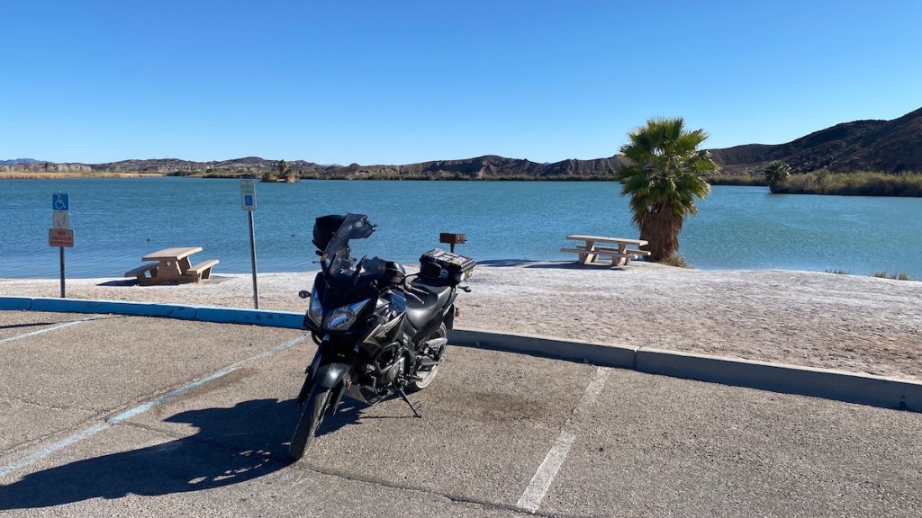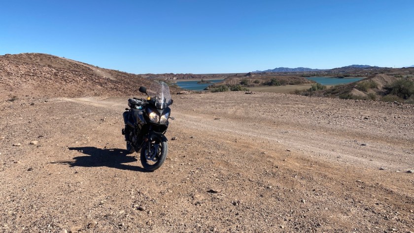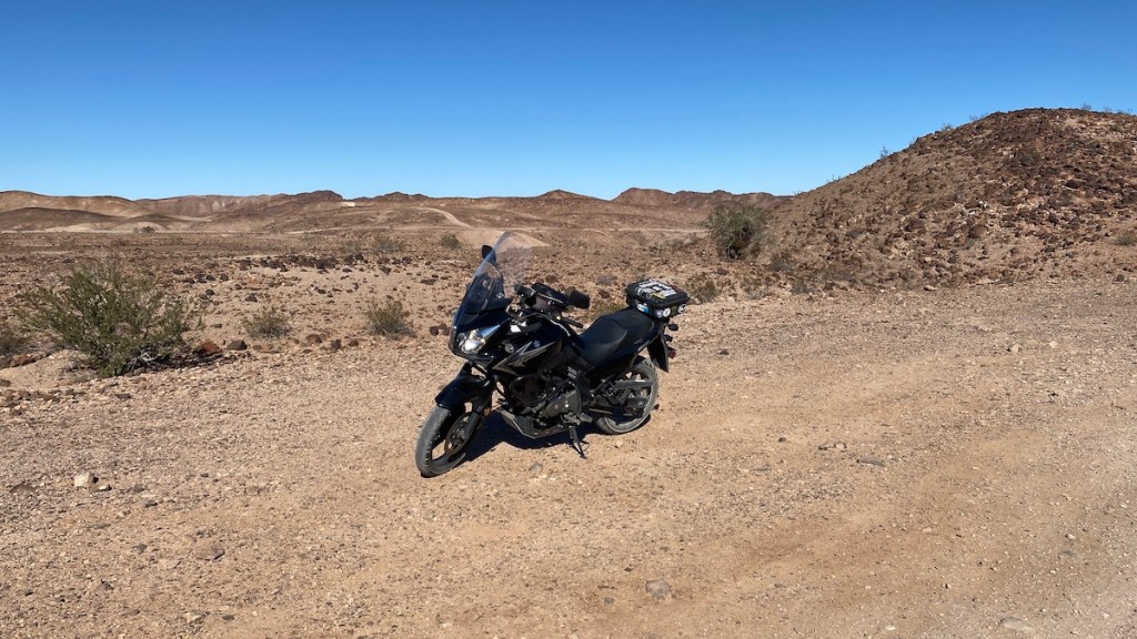 I’ve turned a few leads into actual jobs, so my time is freeing up now that I’m just working and not looking for work at the same time. I rewarded myself with a bike ride yesterday afternoon. After all, I can make my own schedule now, and give myself an hour or two off. While the dirt riding near Quartzsite is too sandy and rocky for my V-Strom, the dirt roads around the Imperial Dam area are mostly hard-packed and solid. I got this bike to ride roads like this as well as pavement, so I decided to try out some dirt, despite still running tires designed strictly for the street.