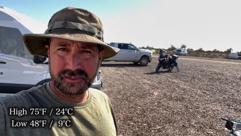This is just amusing. It’s a screenshot from Adventure Van Man‘s latest video. Yes, that’s my motorcycle behind him! I rolled up and parked there while they were hanging out with people. Brian and Kelly went inside to make lunch, and I wandered off to visit a few other people I knew who were camping there. He shot this clip before I left, which is why my bike is there, but I’m not.