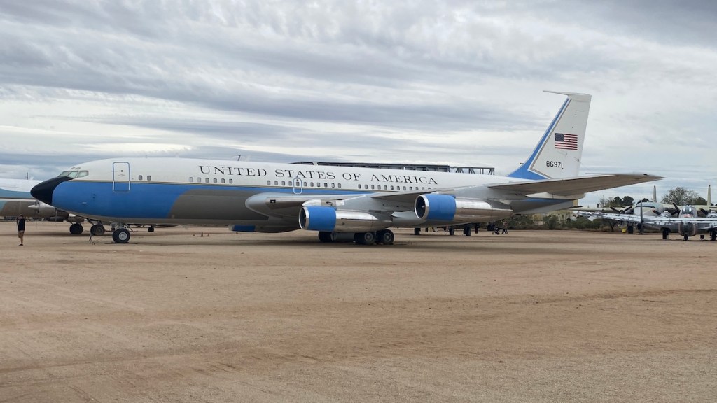 This is a VC-137, which is the military designation for the Boeing 707s converted into Air Force One. This one served President Kennedy and Johnson. Without the Presidential callsign, this exact plane flew the Iranian hostages back to the US in 1981. On this flight, they called it Freedom One instead.