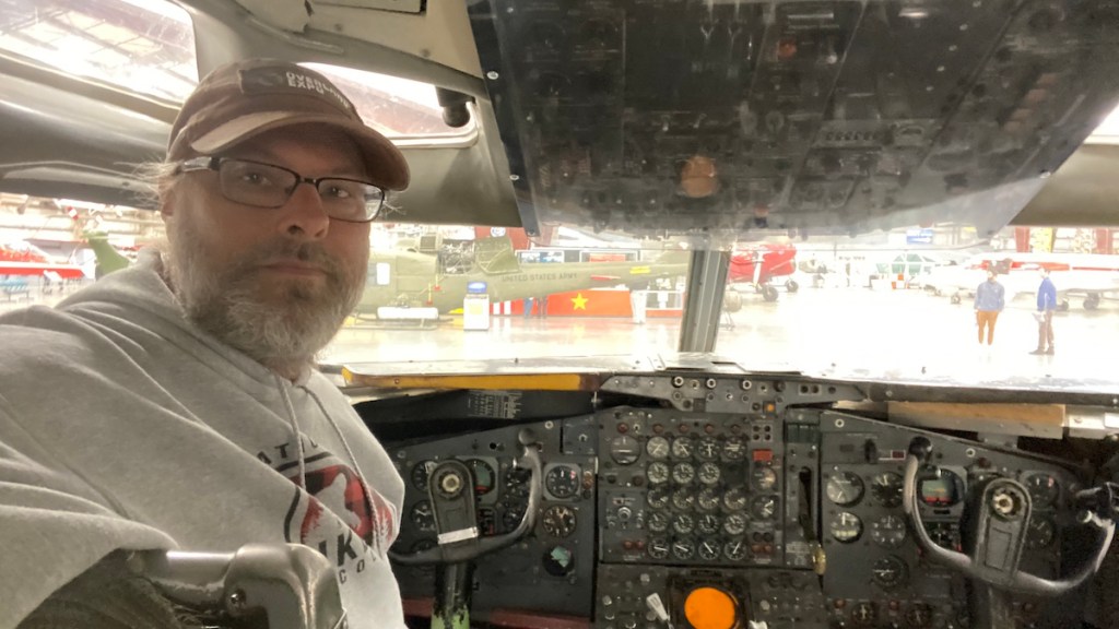 One way this museum differs from most others is that, with a few exceptions, there are no ropes or barriers separating you from the aircraft. In most cases, you can walk up close and peek around them. Here, I’m sitting inside a Boeing 720 (a smaller derivative of the 707) simulator. I recognized the basic controls and instruments, but when I tried to figure out the wall of gauges in the center my eyes glazed over. I’m sure they all mean something, and I have a lot of respect for the pilots who knew how to make these planes work.