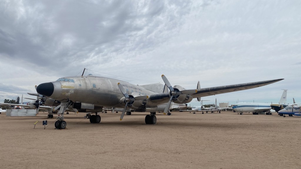 It’s not just about military aircraft here. The Lockheed Constellation on the left is still painted in TWA colors, though like most of these planes, it’s faded a bit in the desert sun. Not far away is another Constellation, the original Columbine that Eisenhower used while he was President. I remember seeing Columbine II at the Air Force Museum in Ohio.