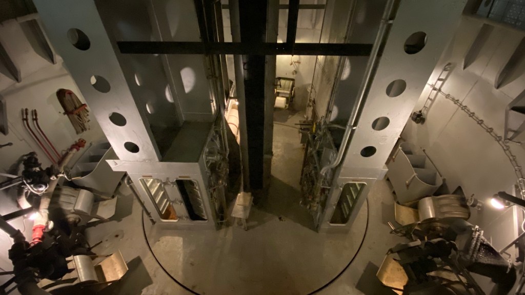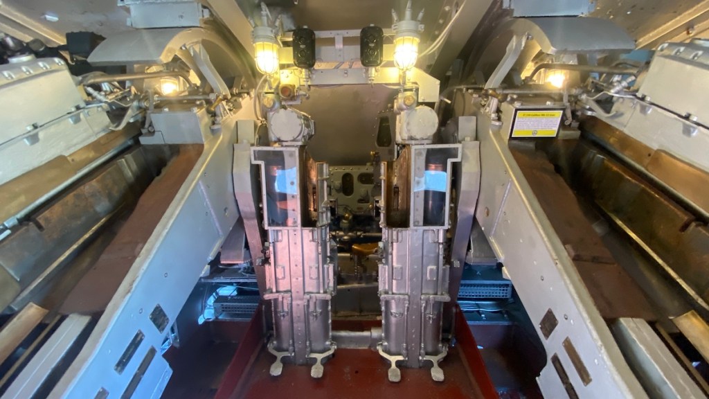 Here’s something I know I didn’t get to see on the USS Massachusetts. On the right are the 16-inch shells that the big guns fired. I’ve read many places that they weigh about as much as a Volkswagen. On the left is an area where they’ve cut away a bit of the super thick armor plating and exposed the bottom of the enormous turret for all to see how it was able to work and swivel. All of this is much bigger than it looks in these pictures, which is amazing considering that while a battleship has a lot more space than a submarine, it’s still pretty cramps in many places.