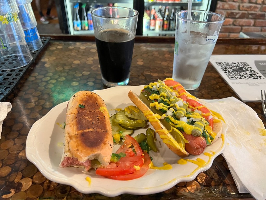 Eventually, I got there and recognized the unassuming “Pub” sign in a strip mall from the videos. I went inside and it’s exactly the kind of place I enjoy discovering in my travels. I had an early dinner of the Chicago hot dog special (which I’m told is nothing like a Chicago hot dog) and washed it down with a Dark Messenger porter. It was probably the best hot dogs I’ve ever had in my life, despite not being genuine Chicago style.