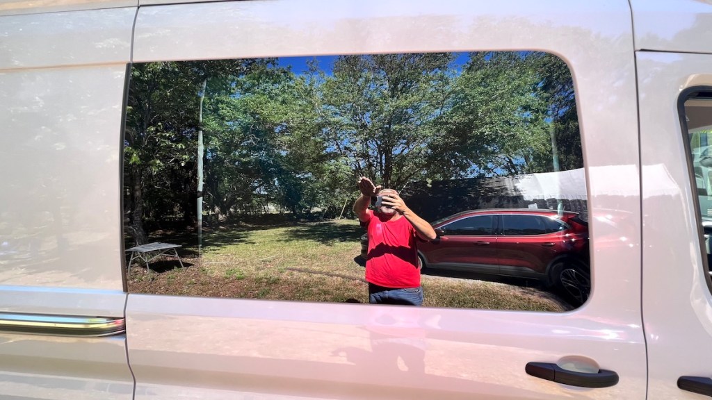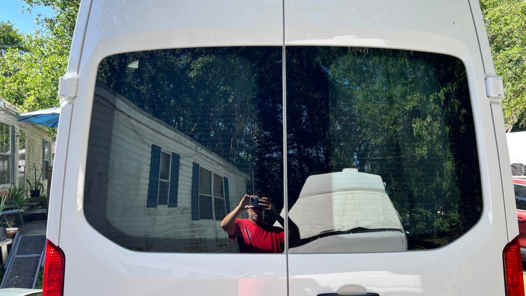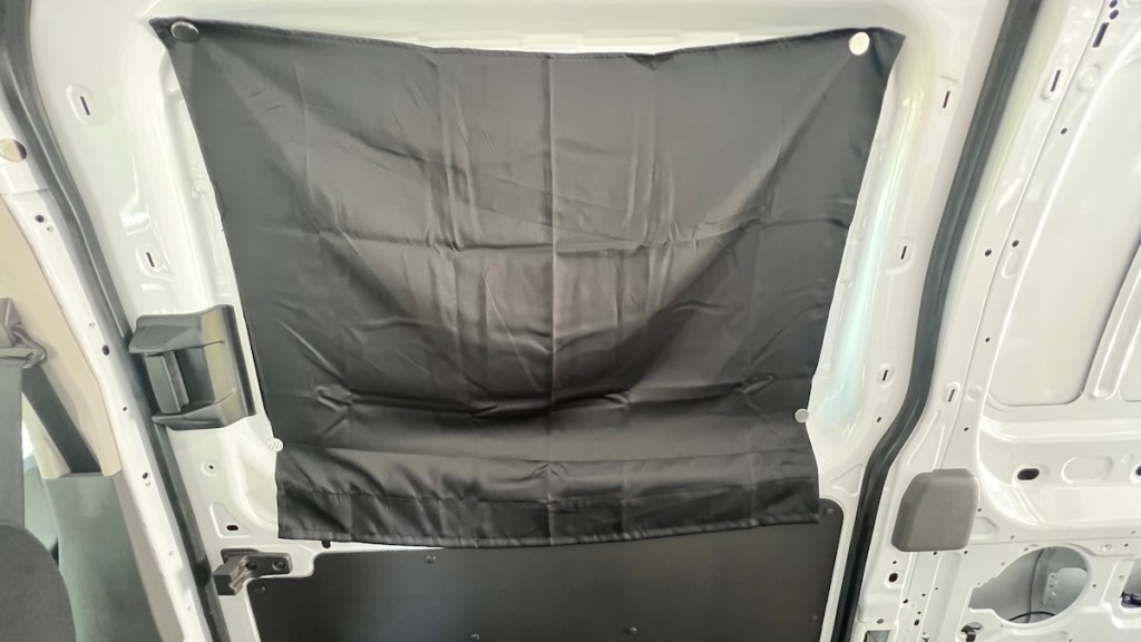 The side curtain doesn’t fit quite as well, but I can work with that. I measured the window to be 42 inches wide, but the curtain doesn’t quite cover it completely, letting a little bit of light bleed around the edges. I need to get more magnets, and then I can use both curtains included in the set to cover the full width of the window. I can’t use a curtain rod here because there’s almost no clearance between the sliding side door and the side of the van when the door is open. (In the reflection in the window, my hand is sticking out to shield the camera from sun glare, in case you’re wondering.)