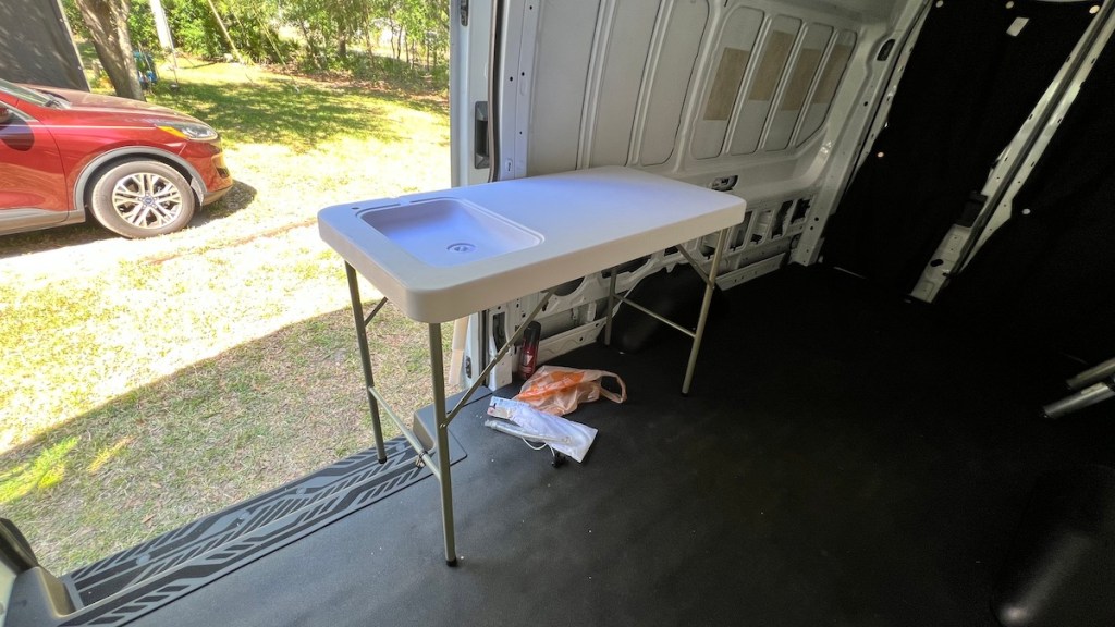 The table/sink came with a faucet intended to attach to a garden hose. Instead, I think I’ll pick up one of those USB-powered pump faucet things. I used one in my very first van but lost it in the fire. They’re actually cheaper than the hand pump faucet I use now, and more convenient to use. I’ll just have to figure out how to mount it.