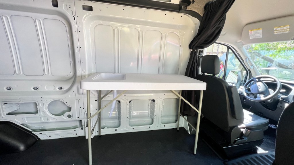 I tried putting it in a couple of different places to see how I felt about it. Putting it next to the side door duplicates the setup I have in my old van. I liked having access to water and the sink from both inside and outside. The side door is so large that I don’t need the full width of the doorway to get in and out. But I also tried it behind the driver’s seat. This could work, but I’m also planning to put my electrical stuff behind the driver’s seat since the vehicle battery is already right under it. Water and electricity don’t mix very well.