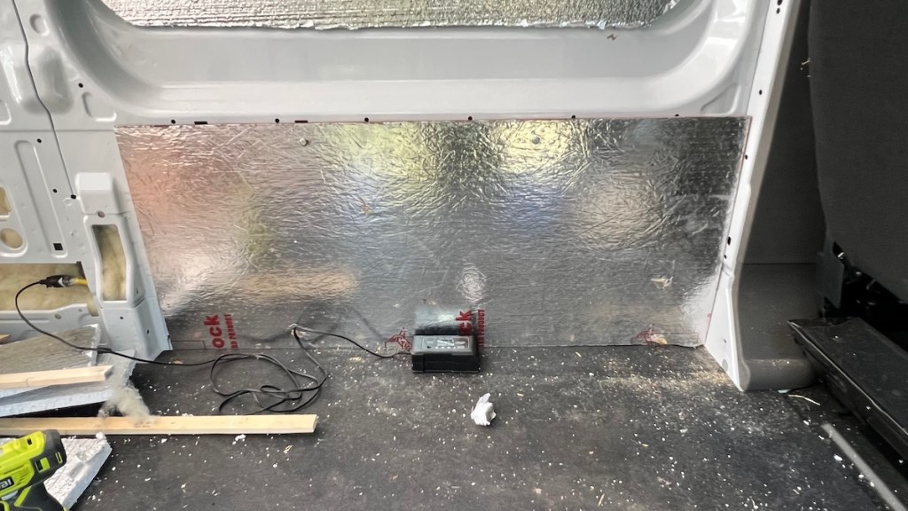 I cut and installed my last two pieces of polyiso this morning. I even punched a couple of holes to mount the original cargo area lights. When I eventually put in a real ceiling I’ll punch matching holes to mount them there, too, but for now, this will work. I have a little bit of wool left, so I’ll end up stuffing a bit more into the nooks and crannies in the side walls until I use it all up. That’s easy and doesn’t even really feel like work.