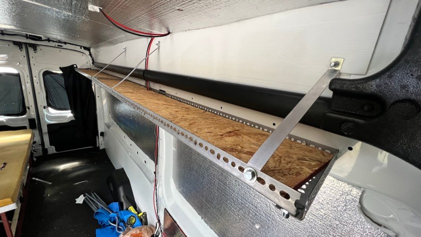 One of the few things bolted in is an upper shelf all along the driver’s side of the van. It turns out a local Ace Hardware sells angle iron for less than half the price of Home Depot, making the same construction method I used in the previous van financially feasible after all. Two six-foot sections, one-foot wide, are bolted to the wall, once again using the Transit’s built-in mounting points. This wasn’t strong enough on its own, but a little “redneck engineering” from my uncle led me to add some upper supports, bolted through existing holes in the sheet metal. Once again, I drilled no new holes to do this. The leftover scrap from narrowing the bed fits perfectly in one section, and a few trims on a couple of other scraps made the other side work, including a gap to allow wiring to pass through. With the addition of the supports, the shelf is solid and not going anywhere.