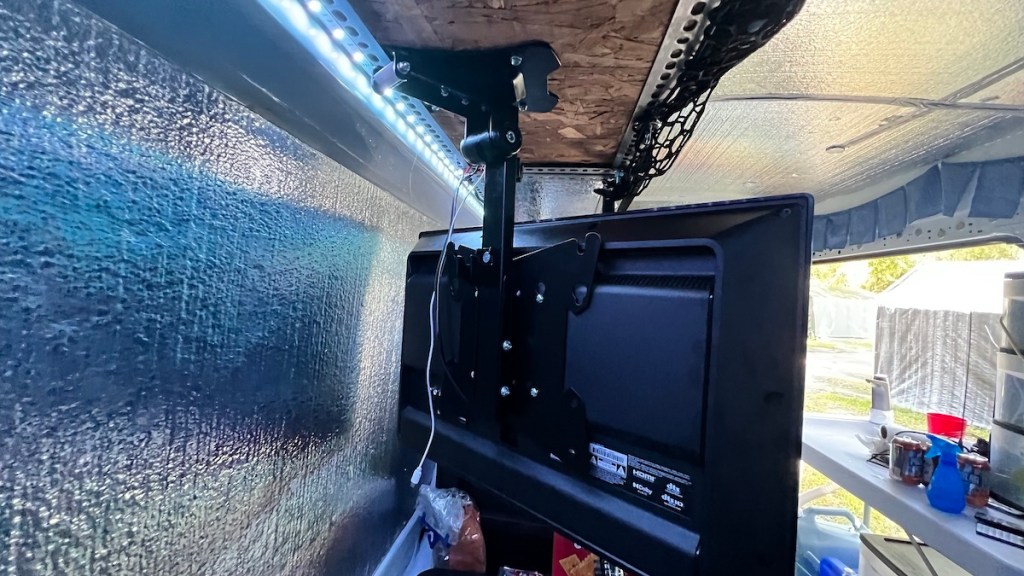 I enjoyed hanging my iPad over the foot of the bed and watching TV and videos on it, but that isn’t an option anymore with the bed running lengthwise. (It’s well worth it for the legroom!) There wasn’t a great way to regain that functionality, and I tried several different ways to do it. So I followed through on something I was already thinking about doing for the last van: getting a smart TV instead. This Vizio TV was $100 from Walmart. I got a mount from Amazon intended to hang a TV from the ceiling, but instead, I attached it to the underside of my shelf. The bracket lets you tilt and lock the TV up out of the way, but there isn’t enough room in the van for me to do that, so I simply mounted it as close to the wall as I could. It’s not that close, with the curve of the outer walls, but that’s okay. There’s still enough room over my desk area for me to put things or set up a laptop. In fact, all I need is an HDMI cable to turn the TV into a large second monitor for my laptop. I wonder if I could be greedy and add my iPad to get three screens?