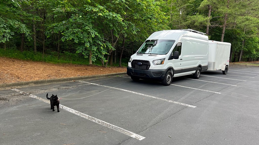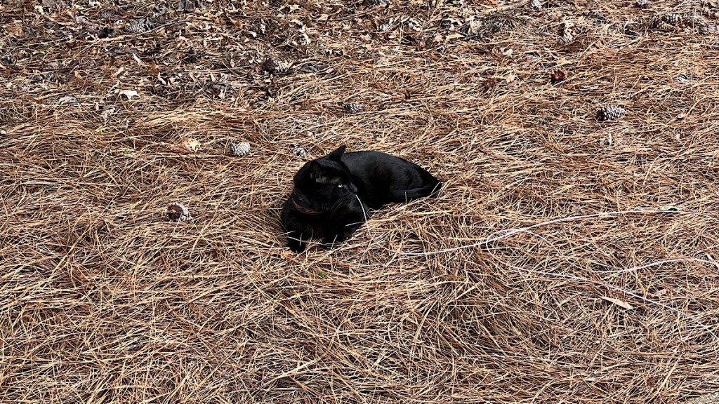Toward the end of the day my back started giving out from being on my feet all day. While unpleasant, it’s also a nice change from my formerly broken foot giving out first. I returned to the van, got cheap gas and dinner at the nearby Buc-ee’s, and returned to my previous overnight stop, Bass Pro Shop. This is by far the nicest Bass Pro Shop I’ve ever spent a night, and among the best parking lots I’ve stayed in. My original plan was to spend one night here and another at a nearby Walmart, but it was so quiet in the RV parking area up top that I decided to try another night. I had no problems. Of course, it might have helped that I made it a point to be gone during the day, and that I parked in a different place the second night, just to make it obvious that I wasn’t moving in permanently. I had a second wonderful quiet night, and Lister got to enjoy a bed of pine needles for a while, something he hasn’t been able to do since we left Colorado last year.