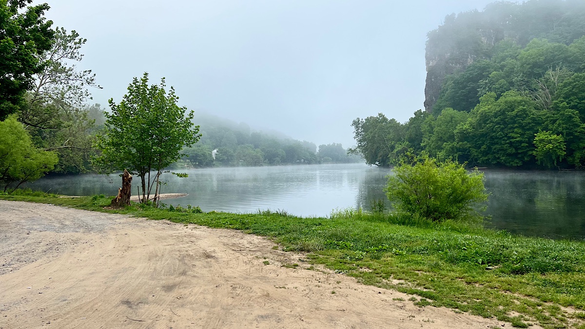 It was quite foggy in the morning. I wanted to let Lister roam a bit and get some work done anyway, but it was just safer to let the fog burn off before going very far. After Google sent me to the wrong place (I turned around before I got stuck in terrain I couldn’t handle), I went to a boat ramp by a river to hang out and enjoy the scenery.