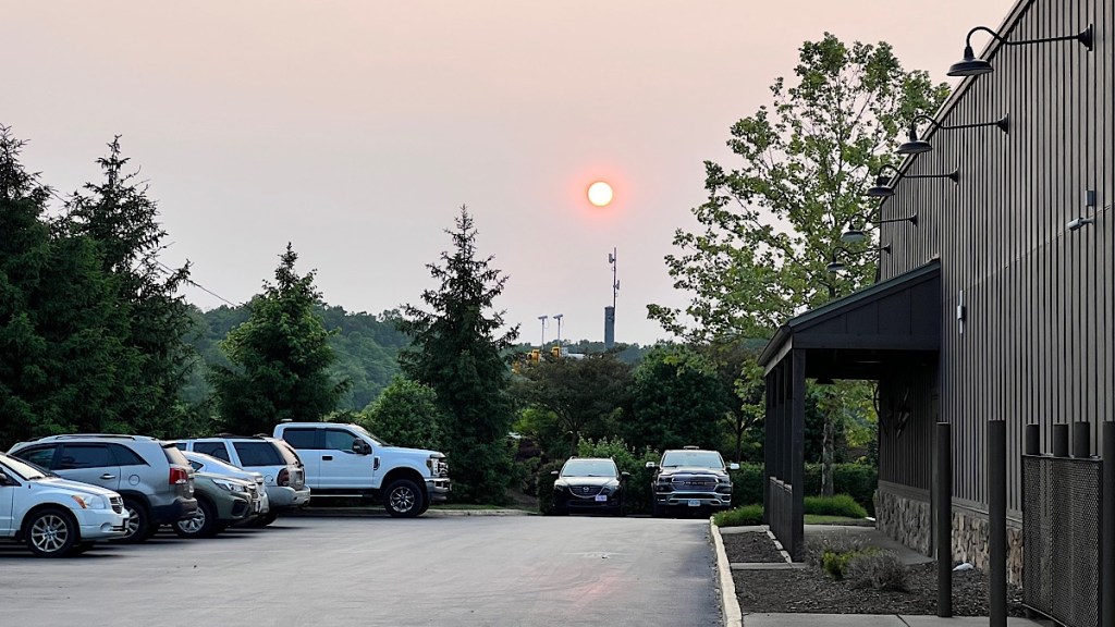 Last night’s sunset was weird. I could look straight at the sun because it was filtered so much it wasn’t too bright. It wasn’t clouds blocking it, either. Friends tell me that this is smoke from wildfires in Alberta, Canada. Wildfire season is off to an early start. I watch them closely when I’m out west so I don’t get caught in one or in the smoke of one, but I haven’t kept up with them back east because they’re not as common. Fortunately, the air quality was still moderate, and it didn’t trigger my asthma.