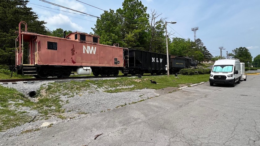 After my exciting laundry stop, I found a nearby park in Bluefield, Virginia. Lister was getting antsy, and I wanted to let him roam around a bit. I had no idea there was a steam locomotive and caboose here, but it was a pleasant bonus. I love such things. Lister was fascinated, too.