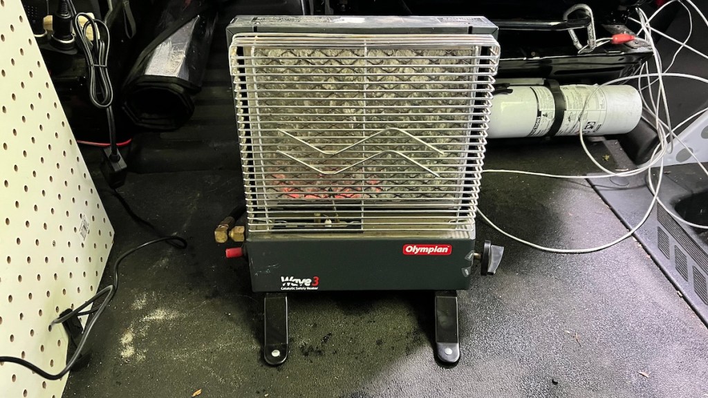 I’ve had to set up my emergency heater, which is the Olympian Wave 3 that served me well in the previous van. I haven’t designed anywhere to keep the 20-pound propane tank inside Smokey II, so I swiped Yellow Wolf’s idea and ran the hose out the window to the tank sitting outside. (The window has to be open slightly to keep fresh air coming in anyway.) For the first time, I’m thankful for the 10-foot hose instead of tripping over it. I’m cranking it on high, and the temperature is slowly going up in here. I didn’t really think I’d need heat before I got the diesel heater installed (it arrives Tuesday, after it warms up again), but I’m glad I got the legs that let me set the Wave 3 on the floor, just like when I was building the last van while it was cold in New Hampshire. I have the roof vent closed but the fan on, in “ceiling fan” mode, to keep the air circulating and the heat spread evenly throughout the van.