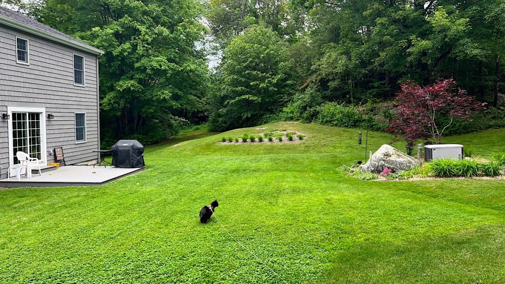 Lister is loving exploring the yard. This is where we stayed the last time we were here two years ago, except with a new driveway I can’t park in the backyard like I did then. But Lister can still visit and watch the birds, chipmunks, and whatever other wildlife comes wandering around — hopefully not a bear this time!