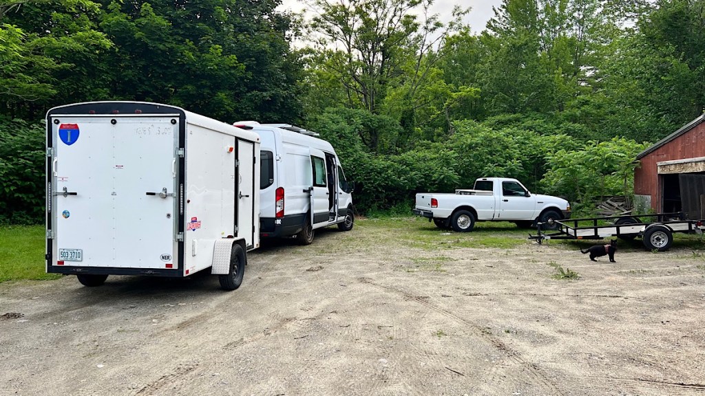 I hooked the van back up to the trailer and just parked in the driveway for the night. I worked in the morning, then started my drive back to New Hampshire. After an enjoyable lunch halfway with a fellow van dweller I met online, I continued a fun, easy drive to my parents’ place in Meredith. At least, it was easy until I dropped down the hill into Meredith. Traffic was awful, but only for a mile or so, and soon I was pulling up their driveway. We played a little bit of Tetris between my van, trailer, and Dad’s tractor, which he was using to push my trailer around. Finally we got me situated for the week, out of the way on the most level ground I could get into, since they live on a hill. I’m in the shade, but their WiFi is excellent, and I’ve plugged the van into the garage, so keeping the batteries charged won’t be a problem despite the shade on my solar panels.