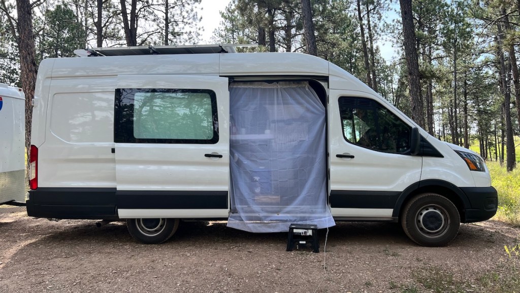 At my last Walmart stop, I tried a suggestion that Birgit made. Instead of dropping $250 on a custom-made bug screen for the Transit, I could drop less than $5 on a sheer curtain and stick it to my side door opening with magnets. There are gaps, but bugs are dumb, and most of them can’t figure out how to get around it. I can see many of them puzzled by it right now, and I only just put it up. If the gap on top turns out to be a problem, I can take it off the bungee I’m using as a curtain “rod” for my blackout curtains, grab a few more magnets, and stick it directly to the wall above the door. I’ll see how this works first, though. Yes, a sheer white curtain is going to get dirty, but if it gets too nasty I can simply replace it. The $250 I would’ve spent on a fancy screen can buy a lot of $5 curtains.