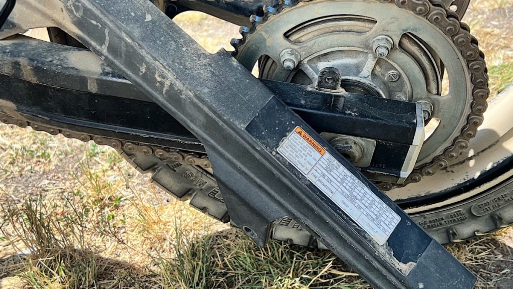 Unfortunately, the rough washboard surface of the road back to camp caused one of the screws that holds my chain guard on to separate its employment from my motorcycle. I’d removed this screw during the tire swap back in New Hampshire, and I must not have tightened it down quite hard enough. Fortunately, I could easily fix this problem with zip-ties. I took advantage of the easy access to the chain to clean and lube it first.