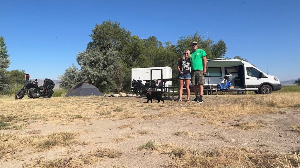 I had a guest for the evening, Joyce, author of the Memoirs of a Crazy Biker Bitch series of books. (I’m not being rude or crude when I call her this — it’s the name she chose for herself!) I met her near her home in Oregon last year. She’s currently on her way to Sturgis from a book signing in Spokane, Washington, and I’m at a convenient almost halfway point for that trip. I certainly have room to spare at this campsite, so I shared it for the night. It was great to see her in full biker mode, something I didn’t get to see when we met for lunch near Portland last year.