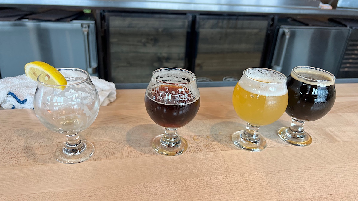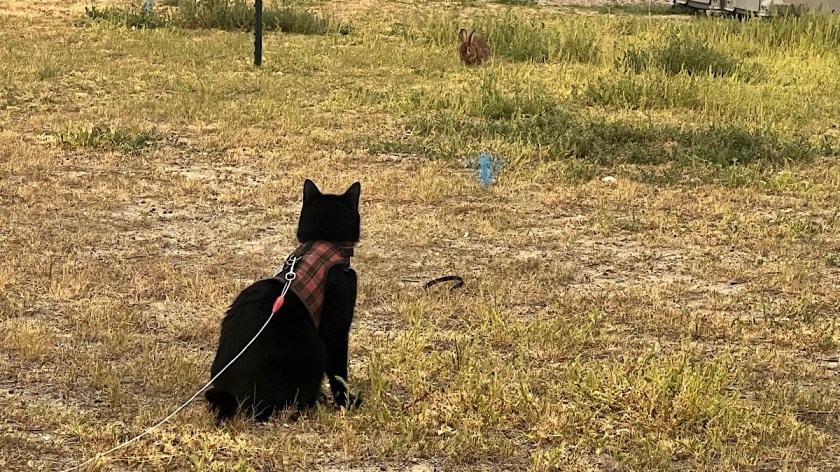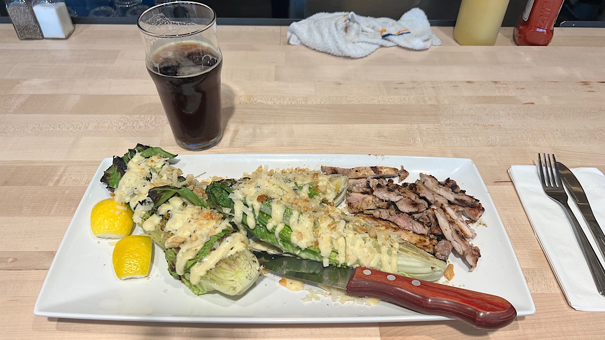 I sampled a few, then had a Bobcat Brown Ale with the most unusual looking chicken Caesar salad I’ve ever seen. All the ingredients were there, though, and it tasted great, which is what really matters. Their Wi-Fi reaches all the way out to the parking lot, so I turned off the hotspots and caught up on some videos. There are lots of wild rabbits around, too, which were fun for both Lister and me to watch.