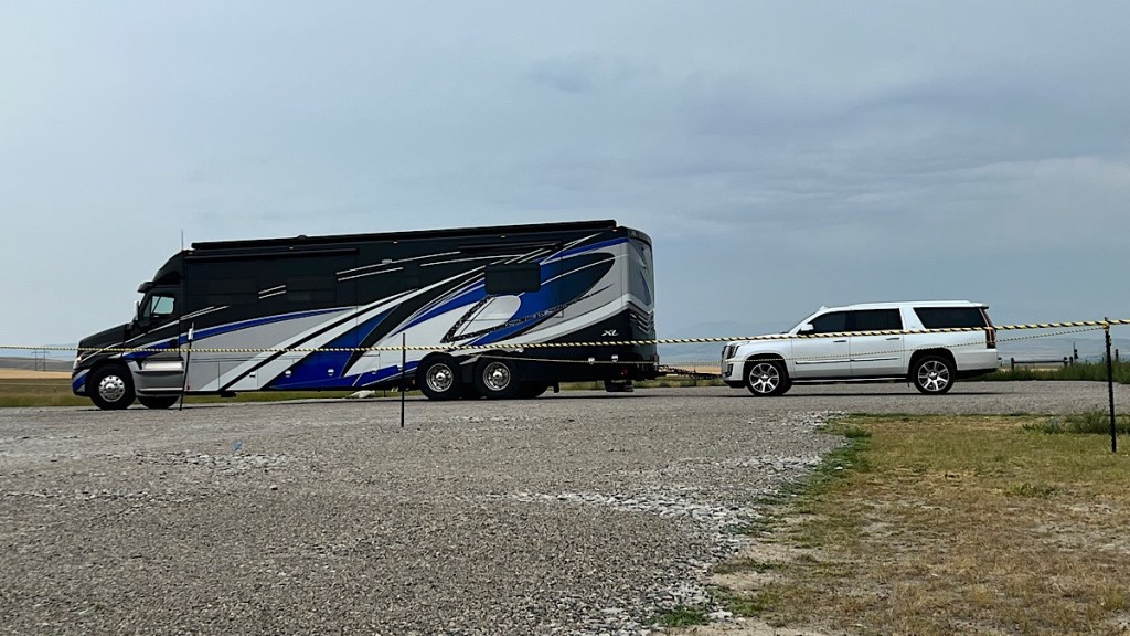 Like this one, with a Cadillac Escalade in tow. An Escalade is big enough to tow a lot of small to midsize campers, but here the RV is towing it!