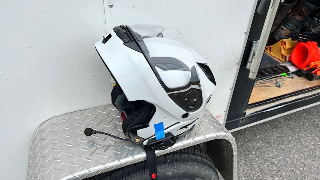 It’s emergency new motorcycle helmet day, too. While leading Joyce back to pavement the other day, the tab that opens my modular helmet broke, making it impossible to open the front of the helmet anymore. I stopped by Maverick Motorsports, and though their selection of helmets was small, I found a new one that fits well and should work just fine, which I need because I’m going to a motorcycle campout tomorrow. I swapped my Bluetooth communicator from the old helmet to the new one. The tape is only there to hold it in place until I unload the bike from the trailer and have space to go looking for my double-sided 3M tape, which should hold it on the new helmet just fine.