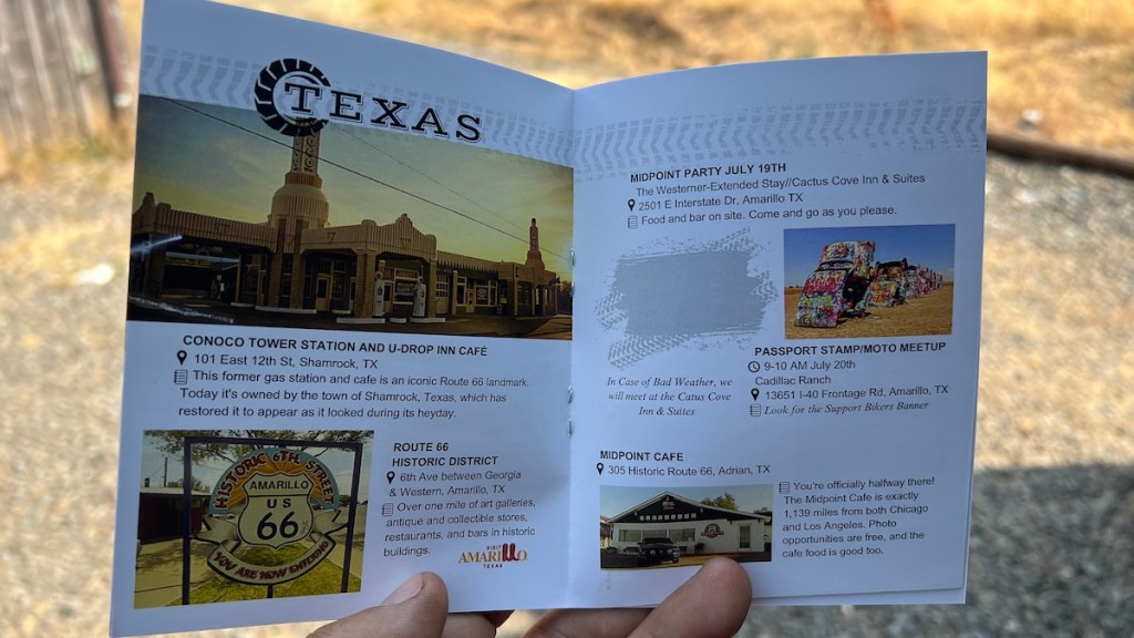 Rather than following a strict route, the group took a week to ride from Pontiac, Illinois, to Victorville, California, with established overnight stops along the way. Otherwise, riders were free to explore the sights that interested them most. This book is where they could collect their stamps at the overnight stops. It also described a few highlights of each day’s ride. I suggested those highlights and wrote those descriptions. I think I even recognize some of my pictures in the book, which I gave them permission to use. As a writer/editor, it’s pretty neat to have a copy of the final product.