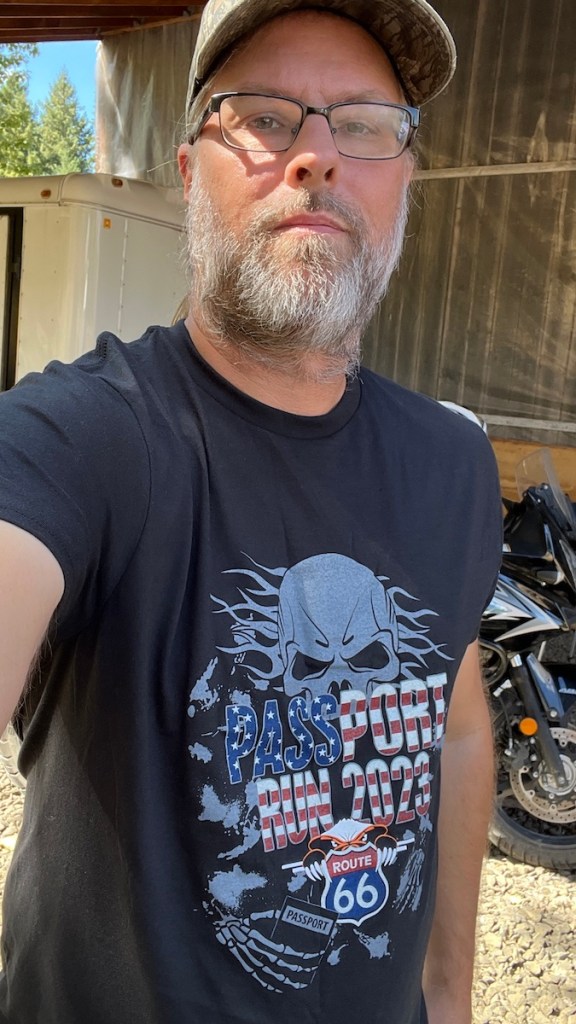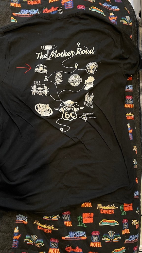 The one I didn’t expect was a goodie bag from The Badgers, with everything I would’ve received if I’d gone on their Route 66 Passport Run. They sent it in gratitude for the help I gave planning the route and suggesting interesting places to visit based on my own Route 66 trip in October 2021. While I haven’t been there and done that, I still got the T-shirt. It even has my logo on it.