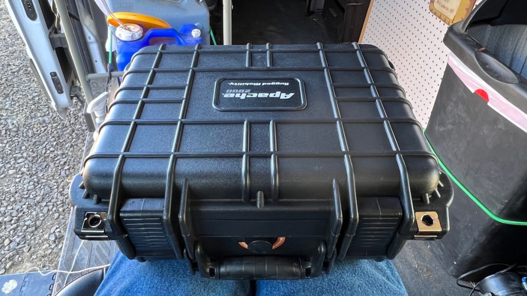 I’d originally wanted to clip this case to the top of my motorcycle gas tank, using the custom Givi mount salvaged from my dead tank bag. I even thought about plugging power into it to charge my phone, batteries, and such. However, it turns out the case is too big to fit between the handlebars, so that idea won’t work. But just now I carried the case home inside one of my saddlebags, so I can just carry it around that way from now on. I wouldn’t want to carry the camera alone in soft luggage in case I drop the bike on it, but inside the case, it’s well protected, so I’m not worried at all. The same type of case has held up to four years attached to two motorcycles, which is why I chose the same time to protect the camera.