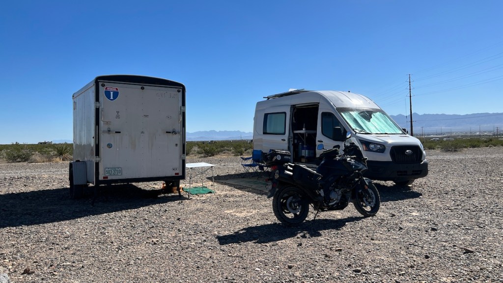 When I returned to camp, it was too windy to put my shade cloth back up by myself. Fortunately, I’d parked in such a way that the van itself casts a good shadow across my camp in the afternoon, so I could still sit outside in the shade. This was the last day temperatures were supposed to touch 90º for a while. It’s cooling off over the weekend (I’m pondering a bike ride through nearby Death Valley while it’s less hot), then warming up again during the middle of next week, which is when I’m already planning to move on anyway.