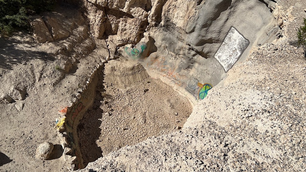 Water no longer flows over the waterfall. It’s the desert, after all. A little bit of the artwork behind it remains, but it’s mostly graffiti now. Apparently, church services and even baptisms were once held here.