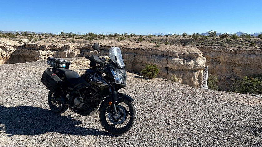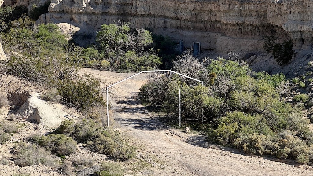 The frame of the main gate still remains. Tire tracks indicate that people still drive through it and into the canyon itself. I tried taking my bike down there, but the road has washed out pretty badly in places, and I didn’t want to take any risks being out here by myself. The V-Strom isn’t as capable in these conditions as my KLR was, and my dirt riding skills beyond gravel roads are a bit rusty these days. So I didn’t actually go into the canyon itself.
