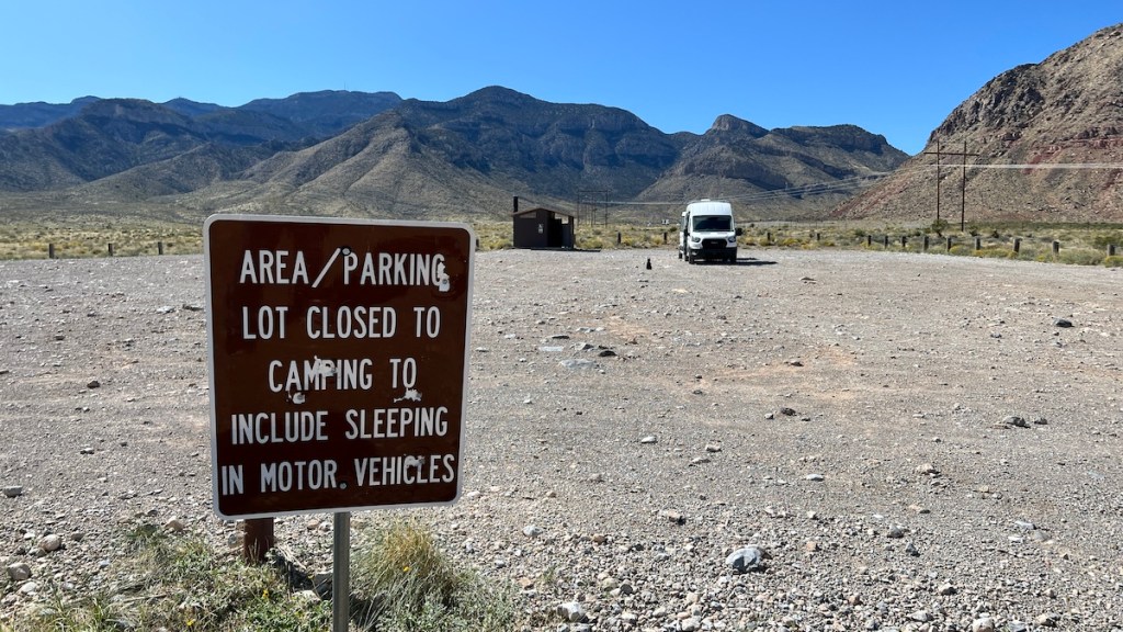 Somewhere between Pahrump and Las Vegas, I pulled into this parking area just off Route 160 to make some lunch, and let Lister roam. This sign is oddly specific, worded specifically to avoid the “I’m not camping” argument from people like me. Ironically, there was even a ranger here when I pulled in. But it was 1:00 p.m. and I was clearly not camping overnight, so we exchanged friendly waves and went about our business. After lunch, I kept driving.