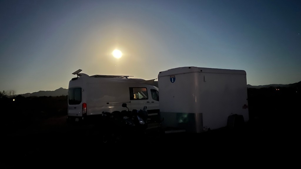 That’s not the sunset, but the full moon rising over my camp. The small dot just below it is Jupiter. I took this picture with my phone, but I got my DSLR out to play a bit, too. Ironically, it was too dark for me to see the controls to set a long exposure. I’ll play with it another time. My phone still takes an amazingly good picture, even though it struggles in low-light conditions.